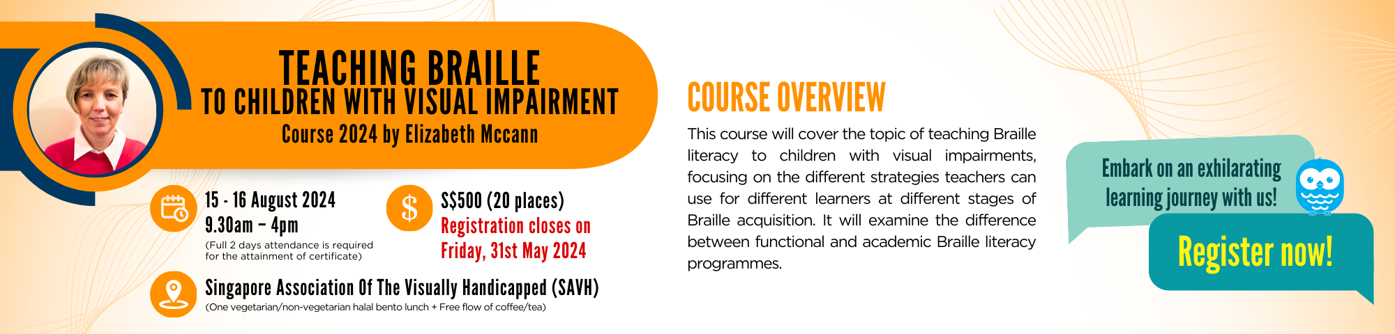 Teaching braille to children with Visual Impairment Course 2024 course by Elizabeth Mccann at Singapore Association Of The Visually Handicapped (SAVH) from 6-8 August and 15-16 August 2024, 9.30am – 4.00pm. Read more about the course at https://bit.ly/3UNcbD0.