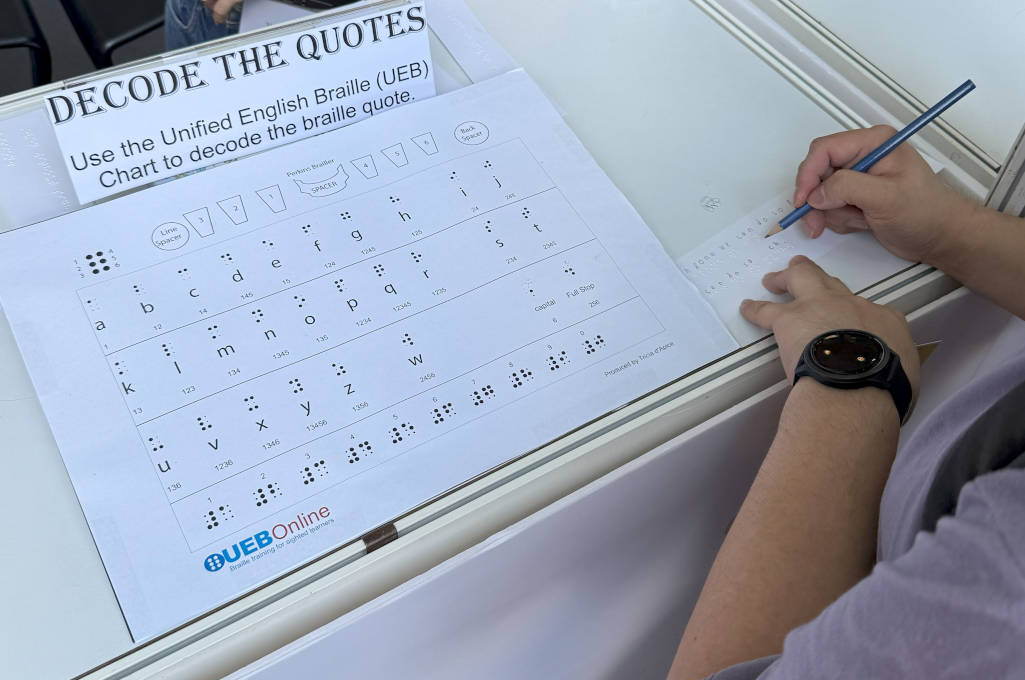 A visitor at iC2 booth takes on the challenge of decoding quotes using the Unified English Braille (UEB) chart