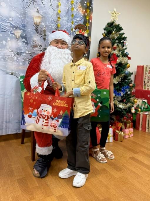 Santa spreads joy by presenting gifts to beneficiaries and taking group photos with their families at the iC2 Christmas Party 2025