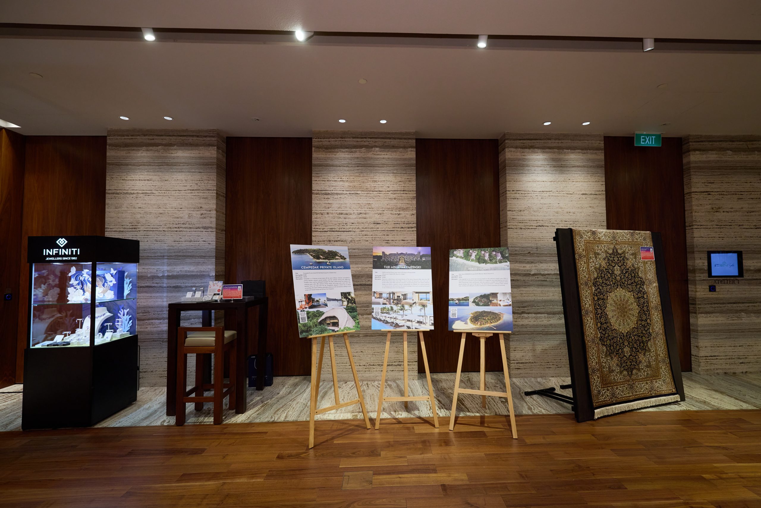 Live auction items: A Pair of Tanzanian Gemstone Stud Earrings by Infiniti Jewels, Cempedak Private Island 3N Mid Week Escape for 2, Cliff Private Pool Ocean Junior Suite at The Apurva Kempinski Bali, Nikoi Island WEEKEND Escape 4D/3N 1BR Beach House for 2, A Intricate Turkish Silk Carpet by Eastern Carpets (from left to right)