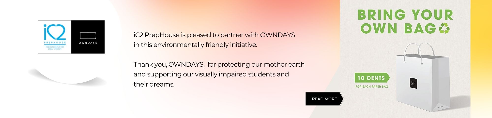 iC2 PrepHouse is pleased to partner with OWNDAYS in this environmentally friendly initiative. Thank you, OWNDAYS, for protecting our mother earth and supporting our visually impaired students and their dreams. Read more at https://www.facebook.com/owndays.sg/photos/a.612638702109200/4399341340105565
